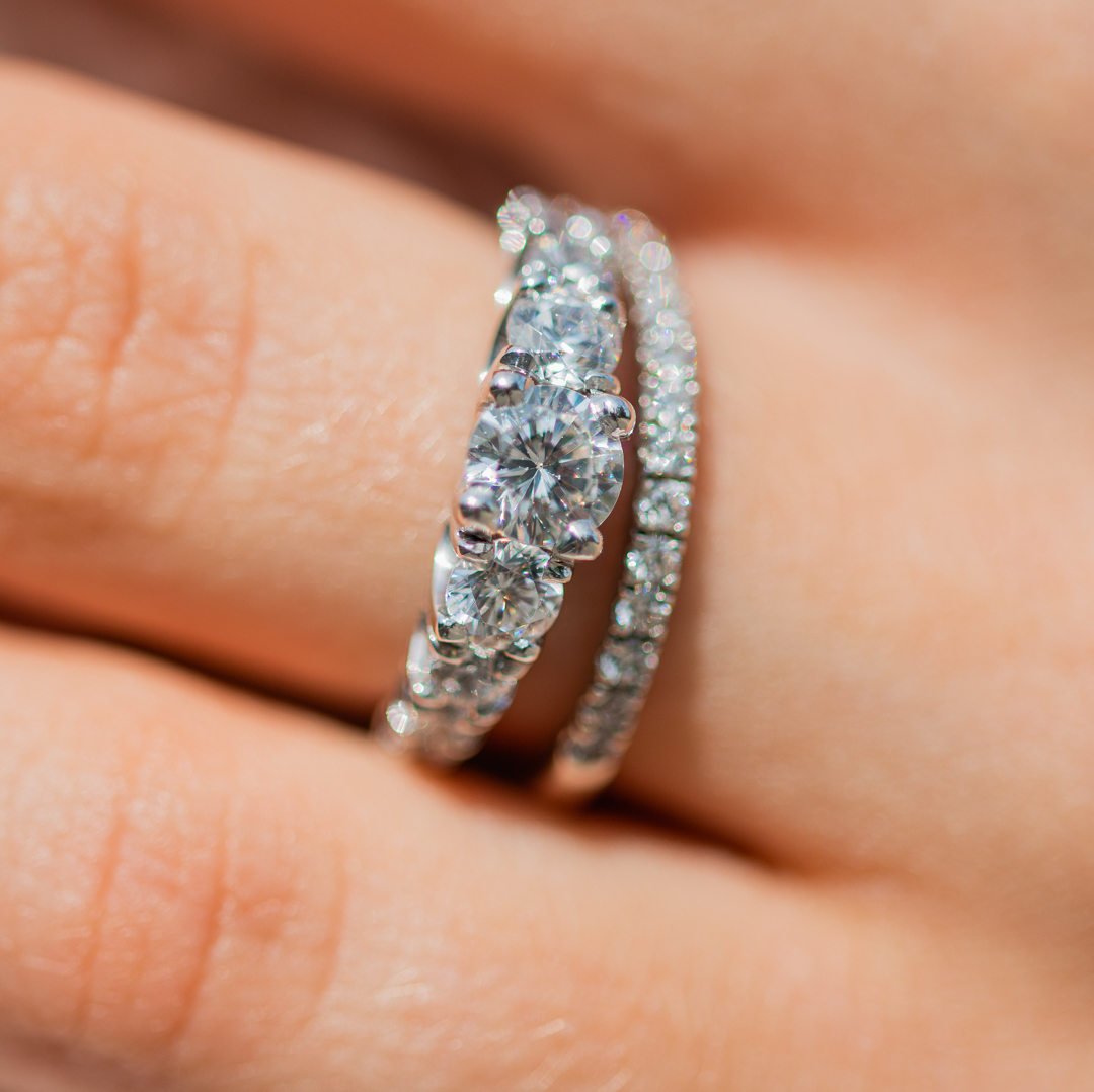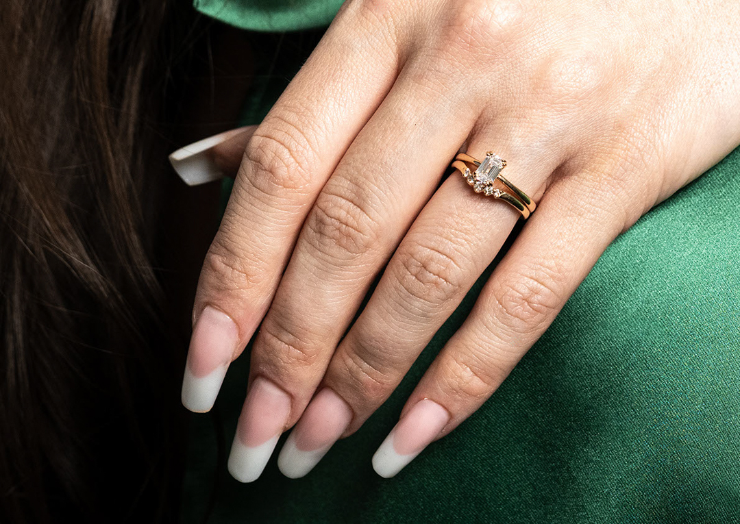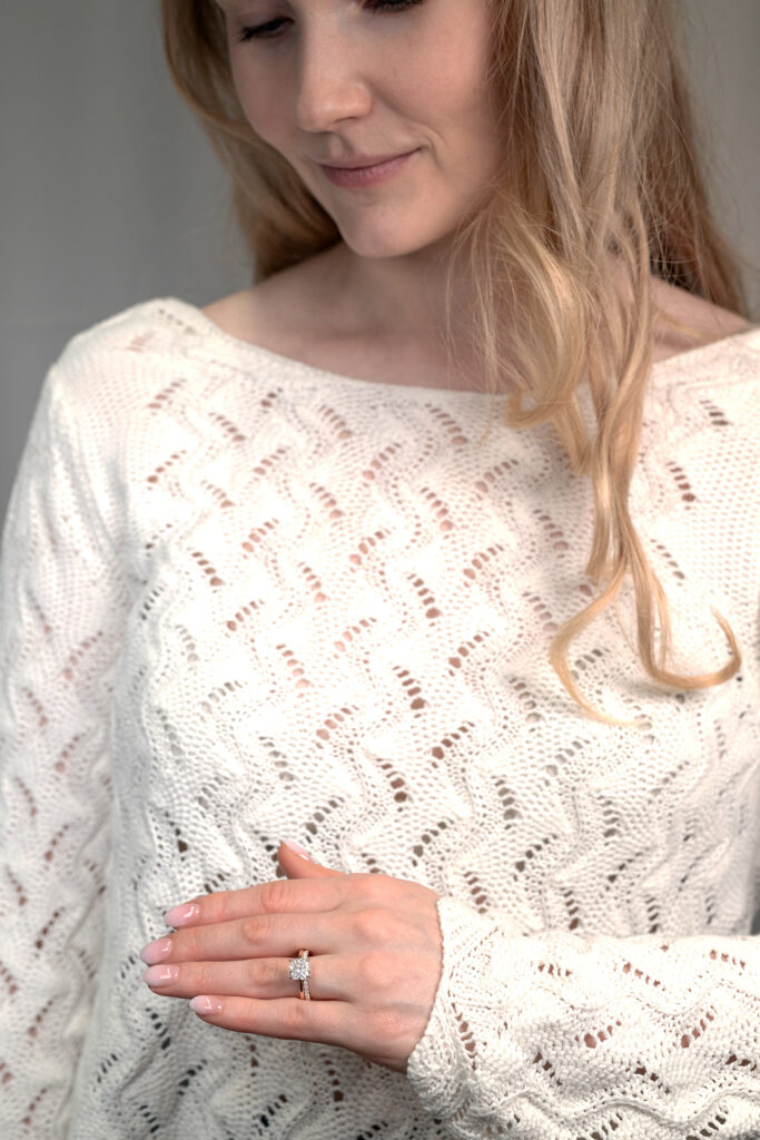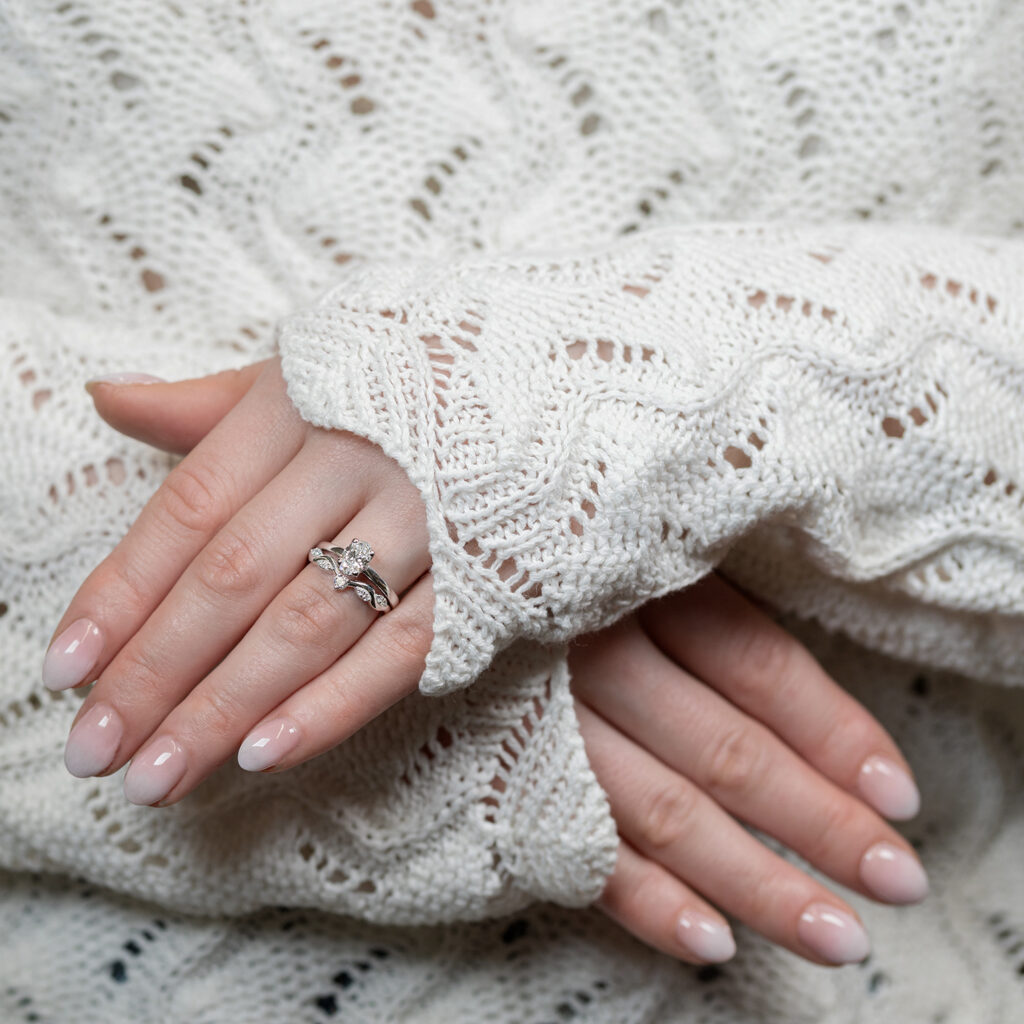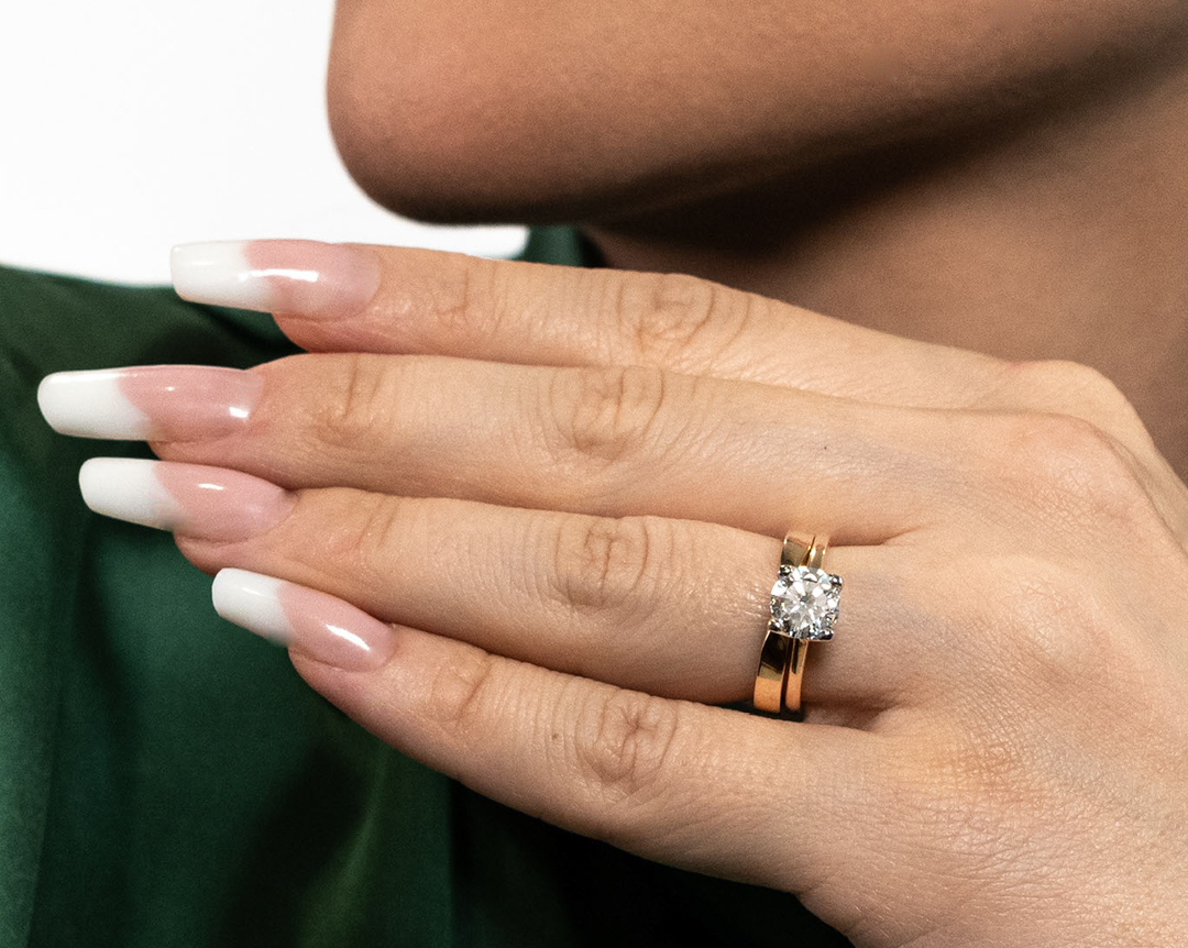 Koska molemmat sormukset on valmistettu Kultasepät Andreasenilla, niiden istuvuus yhdessä on täydellinen ja Classicin timantti nousee kauniisti Halaajan yläpuolelle, eivätkä sormukset riitele keskenään.