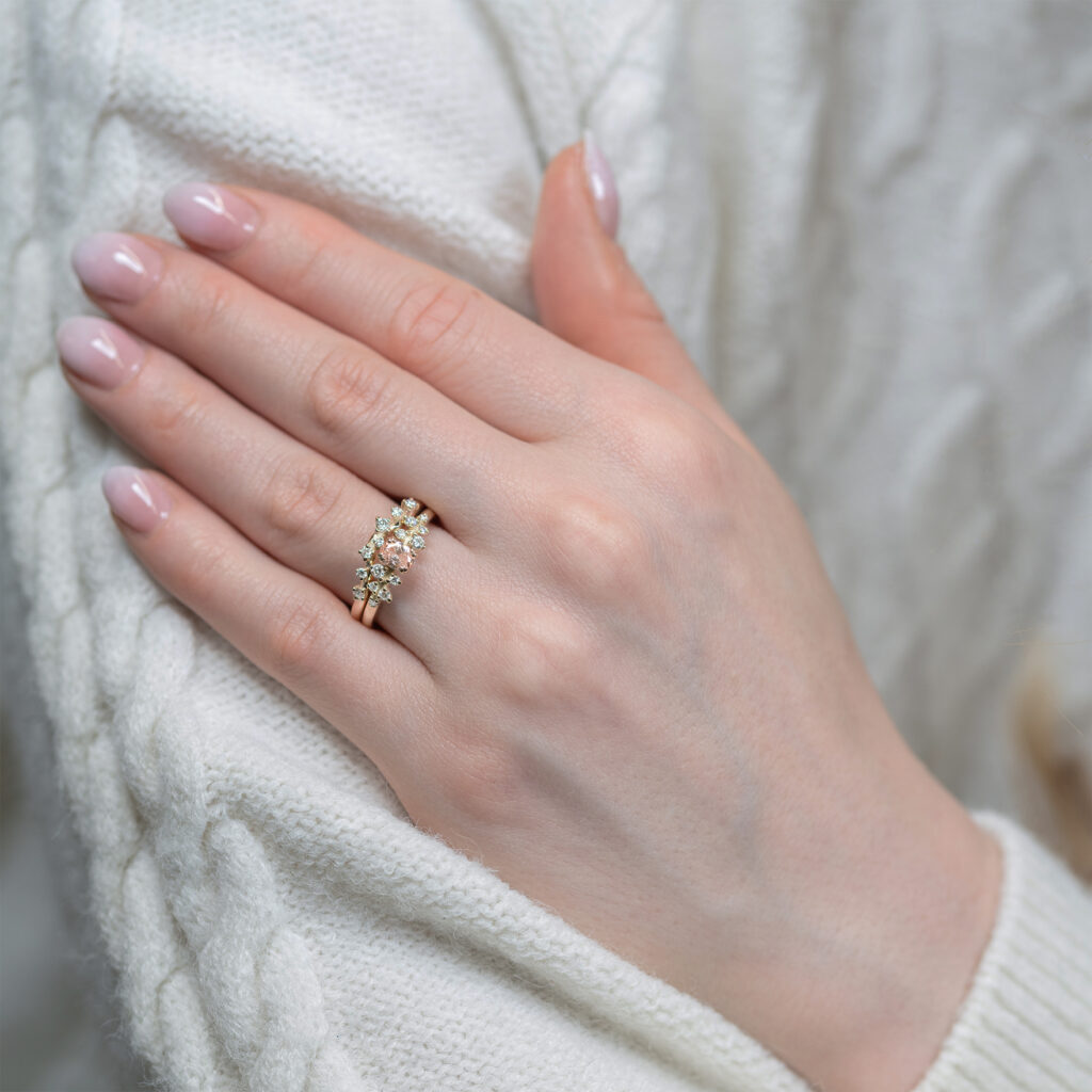 Ruusu-malliston epäsymmetrinen timantti-istutus tekee sormuksesta mielenkiintoisen ja ainutlaatuisen. Sen täydelliseksi pariksi suunniteltu Ruusu Halaaja myötäilee sen muotoja ja viimeistelee kokonaisuuden kauniisti. Tämä yhdistelmä on suunniteltu erityisesti heille, jotka haluavat sormuksiltaan persoonallista ja modernia ilmettä, mutta samalla pehmeää ja romanttista linjaa. Ruusu Halaajan muotoilu varmistaa, että sormukset asettuvat vierekkäin vaivattomasti ja näyttävät yhdessä suunnitelluilta.
