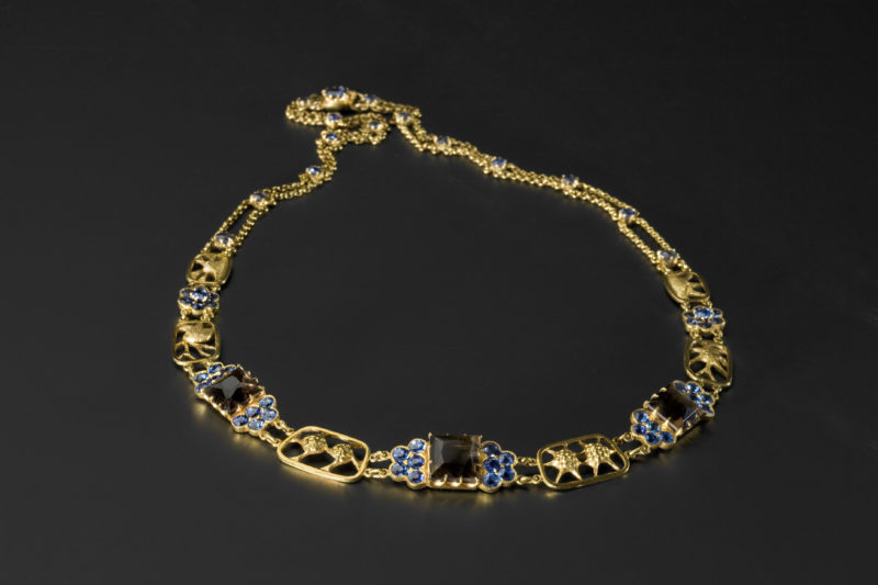 Kaulakoru, kultaa, safiireja ja savukvartsi. Omistaja Serlachiuksen taidesäätiö. Valokuvaaja Rauno Träskelin.