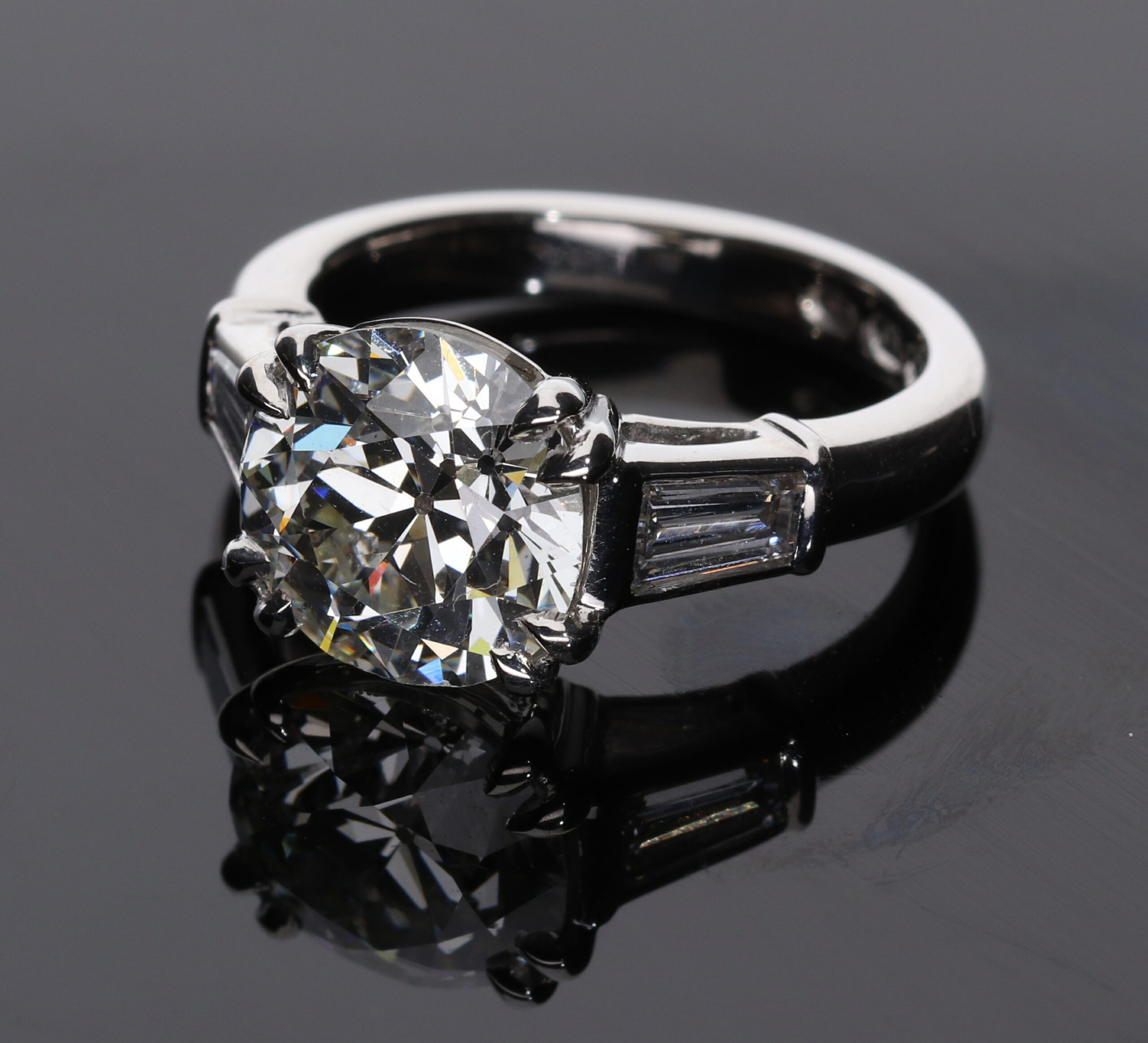 Istutimme asiakkaan oman upean vanhan hiontaisen 3ct painoisen pyöreän timantin kahden muotoillun baquette-hiontaisen timantin väliin. Sormuksen malli on inspiroitunut Elisabeth Taylorin kuuluisasta timanttisormuksesta.