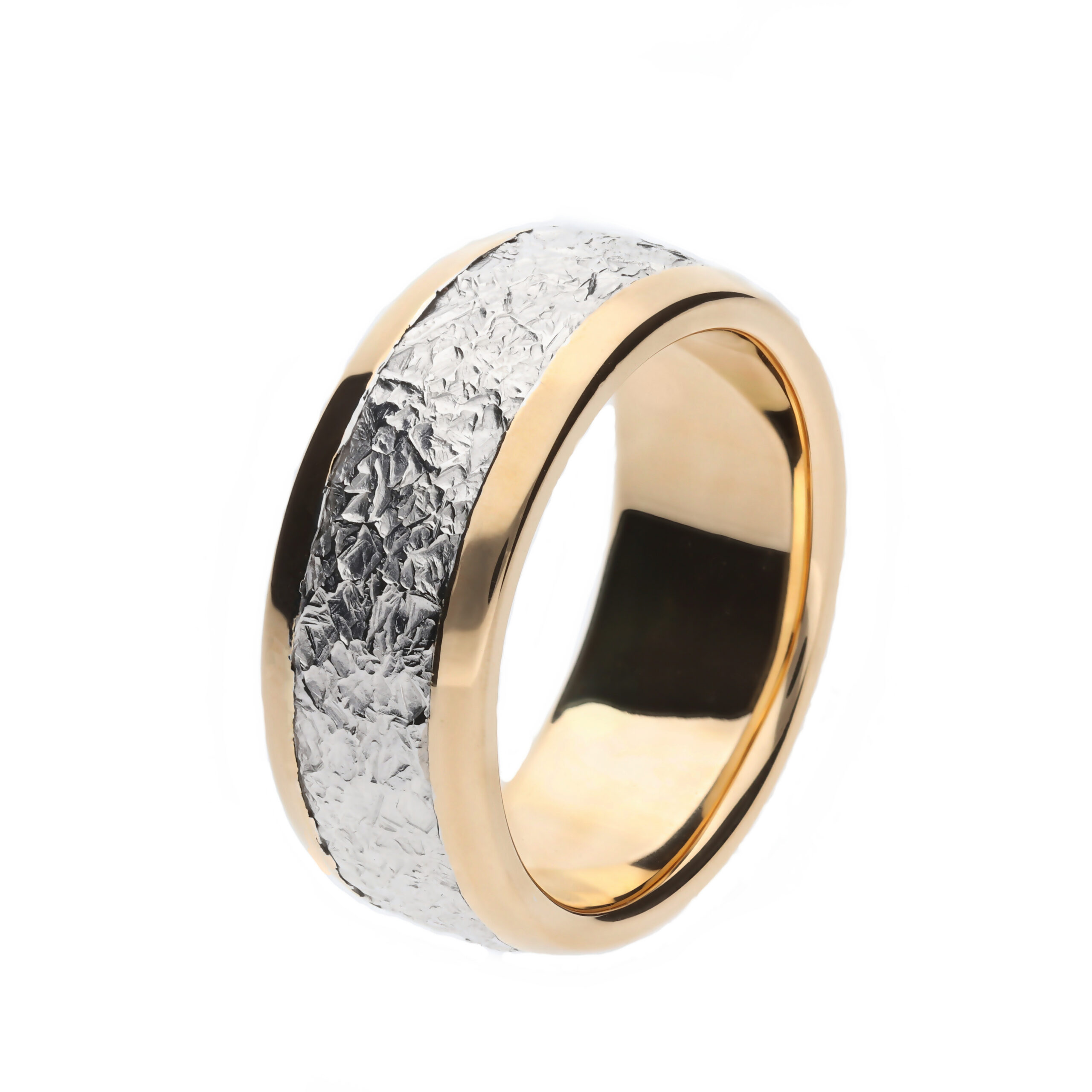 Valmistimme asiakkaan toiveesta erikoisversion Hohka-taotusta sormuksestamme kaksivärisenä. Sormuksen valkokultaisessa keskiosassa on tyylikäs Hohka-taottu panta, joka on puristettu keltakultaisen reunallisen rungon päälle. Vastaavanlainen runko on mahdollista toteuttaa esimerkiksi myös muilla taotuilla malleillamme!