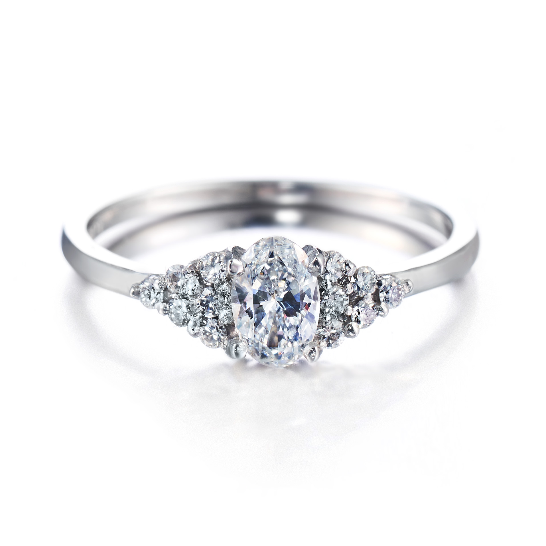 Valkokultainen Isla-sormus ovaalitimantilla ja 12 sivutimantilla: