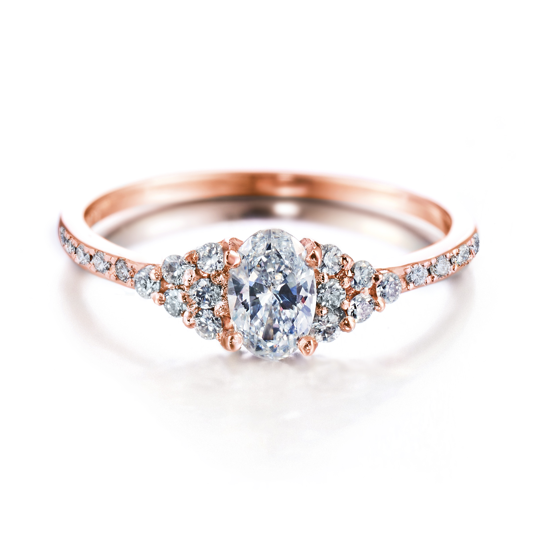 Punakultainen Isla-sormus ovaalitimantilla, 12 sivutimantilla ja runkotimanteilla: