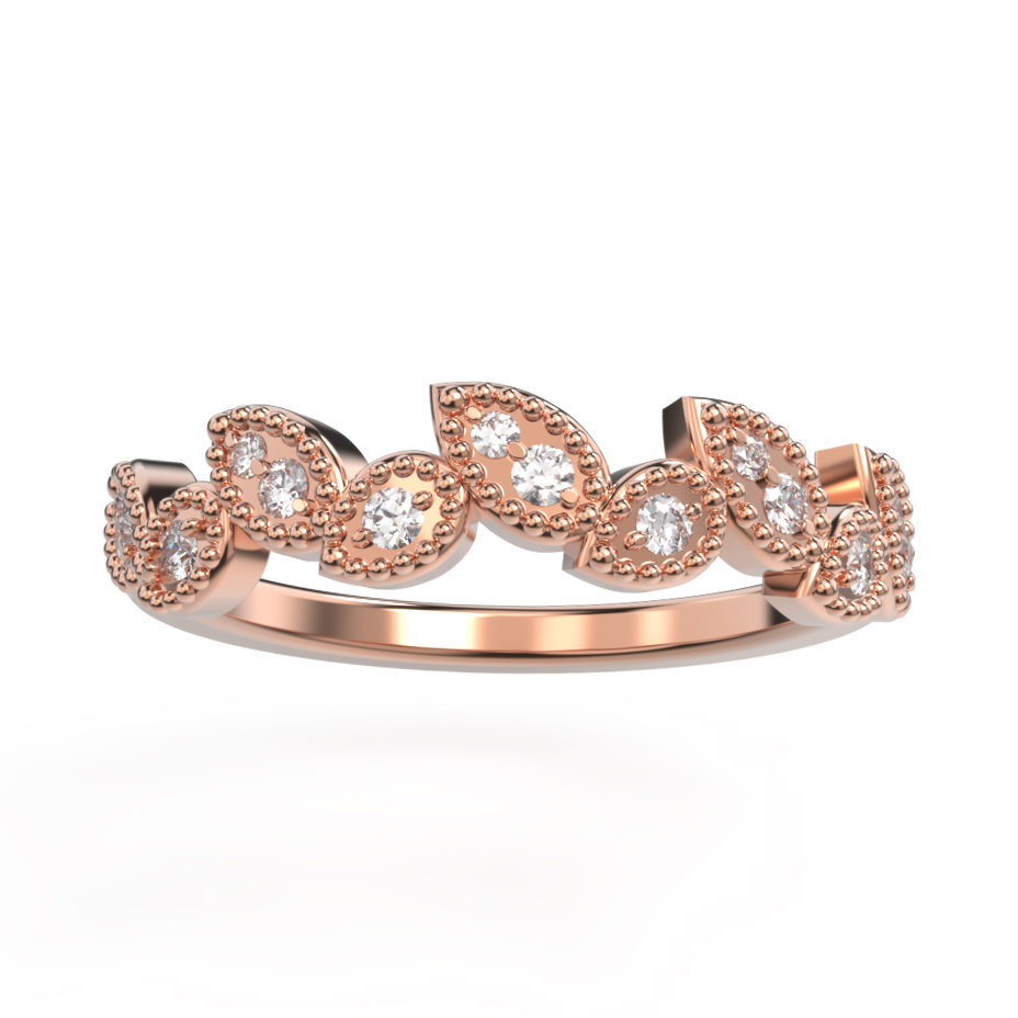 Tämä siro lehdykkäkuvioinen punakultasormus valmistettiin asiakkaan toiveiden mukaan. Orgaanisen näköinen runko sommittelee timantit herkästi ja sormuksen reunoja koristava krysanttirivi viimeistelee sen tyylikkään ulkonäön ja tuo siihen ripauksen ylellisyyttä. Tämä sormus on henkilökohtainen ja erityinen symboli, joka kertoo ainutlaatuista tarinaa.