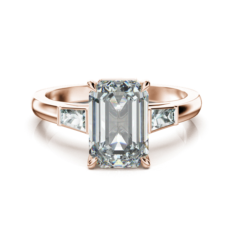 Punakultainen Elizabeth-sormus tuo klassiseen muotoiluun pehmeän romanttisen sävyn. Smaragdihiottu timantti hallitsee sormuksen keskipistettä selkeällä ja jaloilla linjoillaan, kun taas kapenevat baguette-timantit kehystävät sitä kuin valonsäteet, jotka viipyvät hetken ennen katoamistaan.