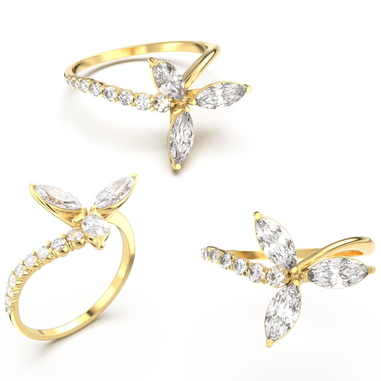 Suunnittelimme ja valmistimme tämän kukkais-henkisen sormuksen suunnittelukilpailutyöksi vuonna 2024. Muotoa kukan terälehtiin tuovat markiisi-hiontaiset sirot timantit, sormuksen runkoon haluttiin orgaanista muotoa ja pieniä kastepisaramaisia timantteja.