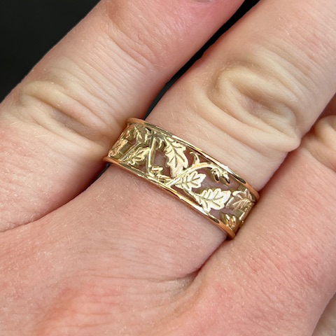 Suunnittelimme yhdessä asiakkaan kanssa näyttävän keltakultaisen leveän filigraani-tyylisen sormuksen tammenlehdillä ja tammenterho-koristeilla.