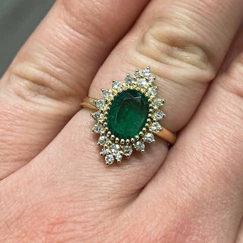 Uniikki halo-sormus smaragdilla